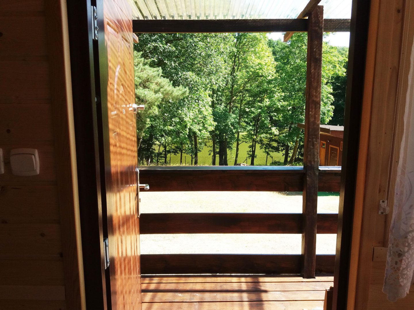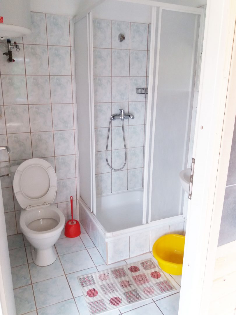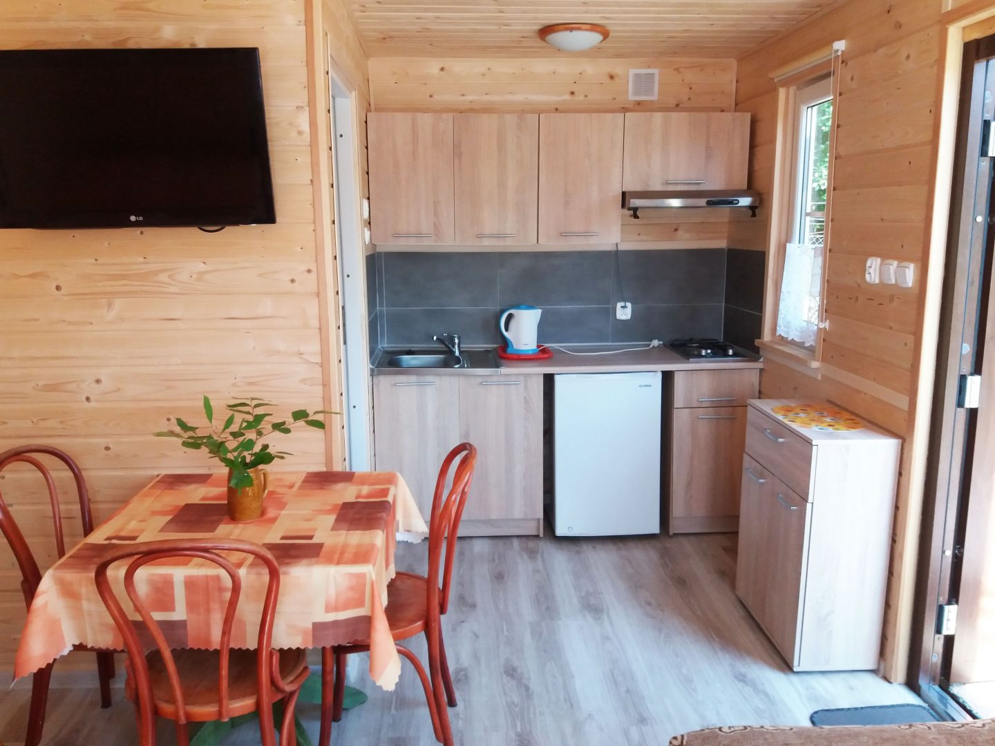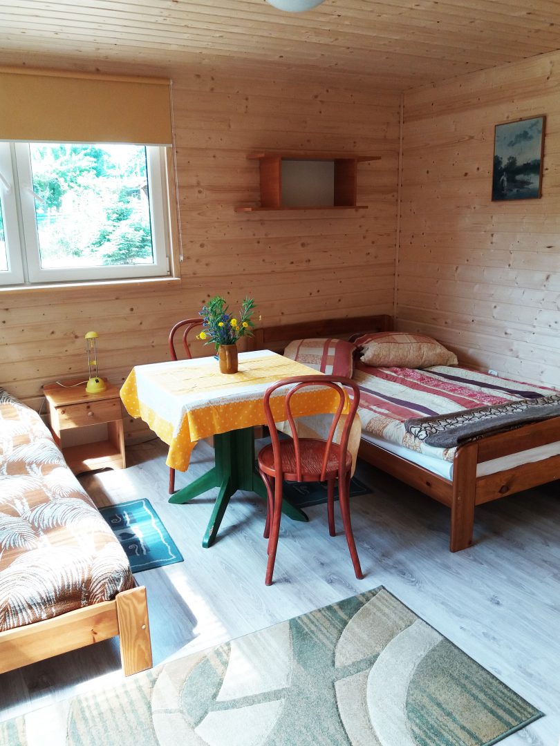 Do dyspozycji Gości oddajemy piękny, świeżo wyremontowany, drewniany domek, z jednym łóżkiem małżeńskim (podwójne) i pojedynczym, jednoosobowym (90 x 200 mm), szafy, szafki nocne, lampki nocne, telewizor z TV naziemną, aneks kuchenny z kuchenką gazową, czajnikiem, lodówką, zestawem podstawowych naczyń, garnków i sztućców dla 3 osób, oraz łazienką z prysznicem i ubikacją.