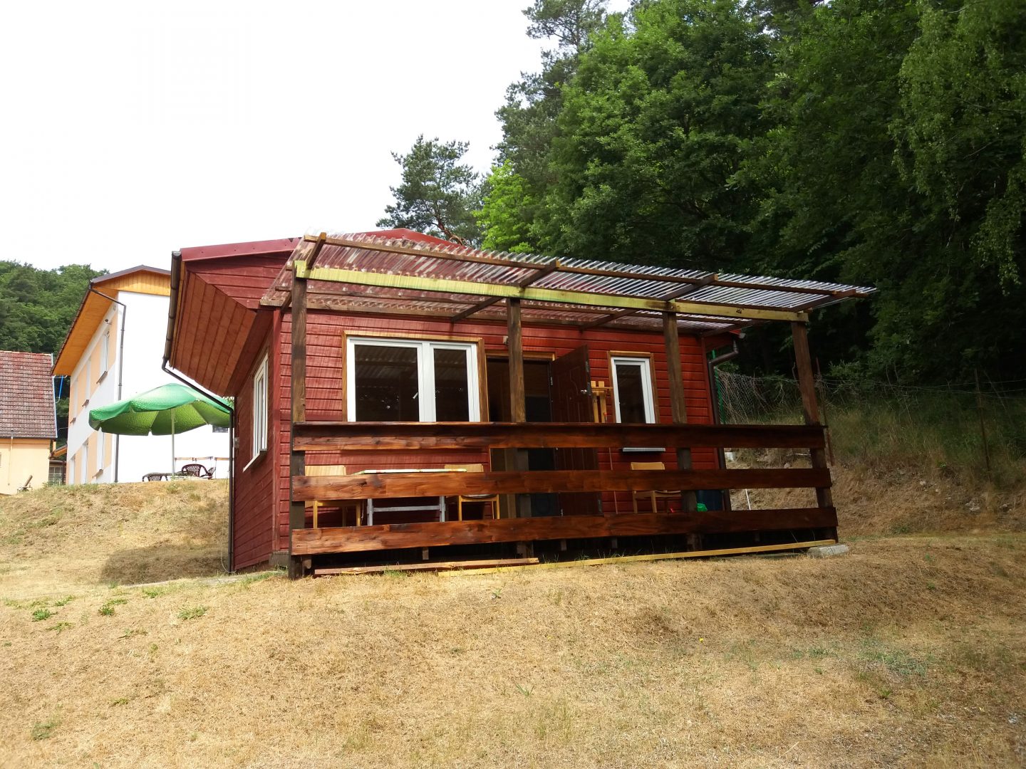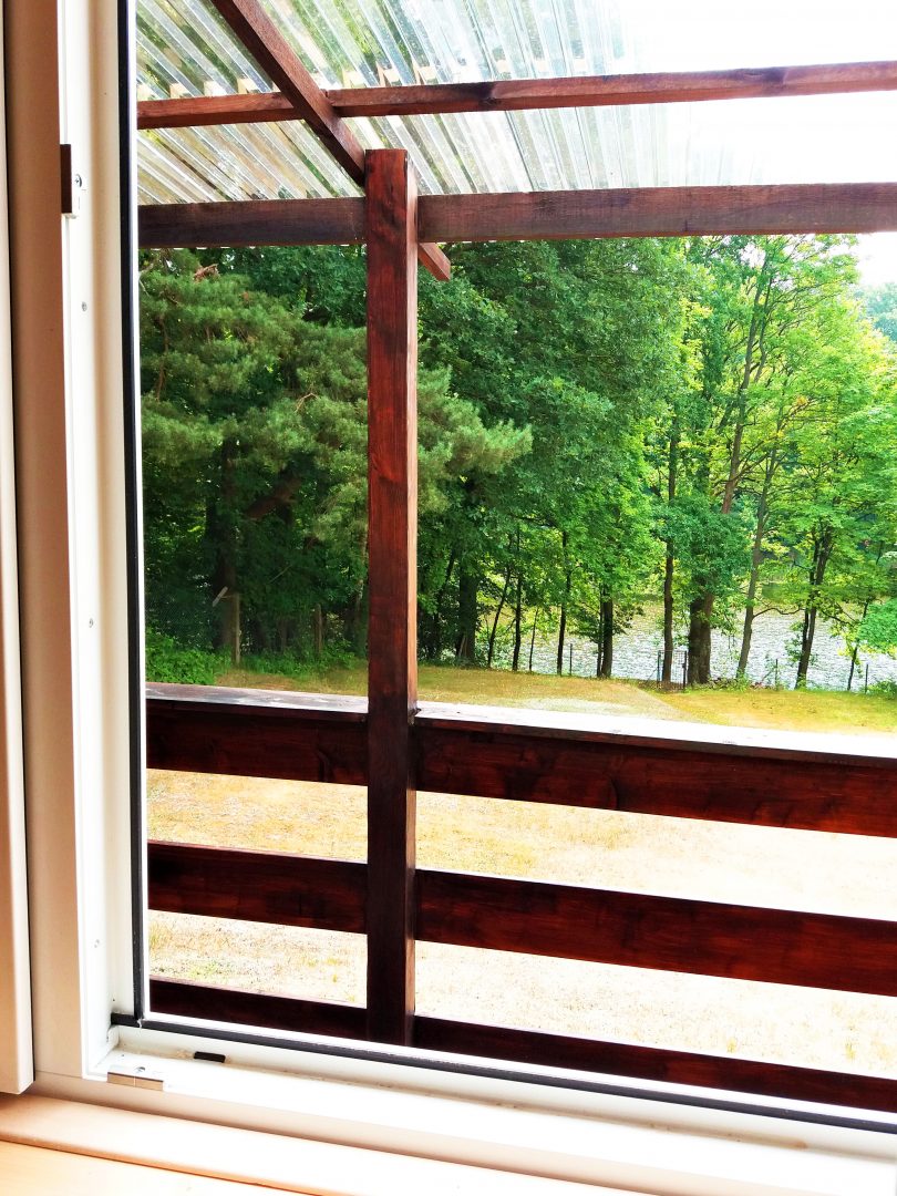Poza tym domek posiada zadaszony i oświetlony taras zewnętrzny ze stolikiem, krzesłami i metalowym przenośnym grillem.